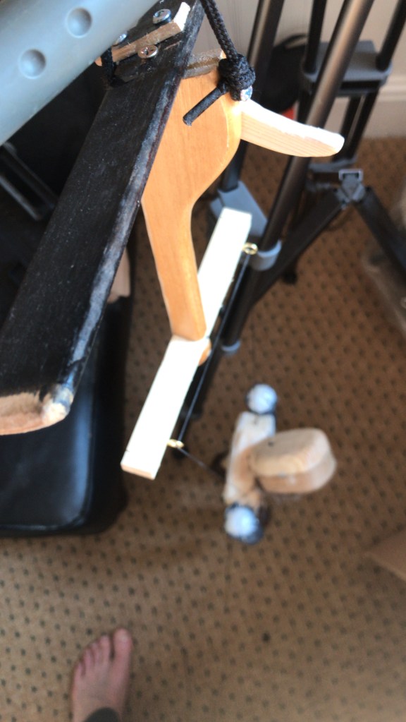 He is progressing steadily, the marionette control system is about ready, trousers done, need to reattach his feet and make a jumper, hat and any other bits and bobs.